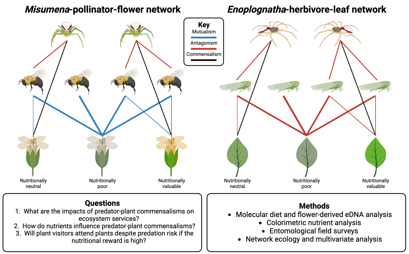 Using model systems involving spiders and the plants they commensalistically use2, this project will explore how predator-plant commensalisms drive ecosystem service provision and how nutrients structure these interaction networks3. The project will include training in molecular dietary and eDNA analysis, nutrient analysis and entomological field surveys to construct and analyse merged networks4. Using network approaches to analyse the influence of nutrients on indirect interactions5 and ecosystem services will answer three key questions: