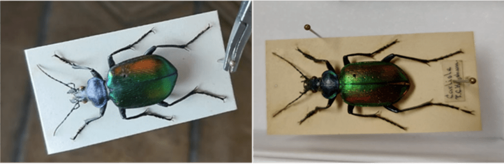 This month, our species of the month is Calosoma sycophanta, the forest caterpillar hunter! This was the beetle that Jordan and Kyle went looking for in Belgium. It’s a large ground beetle (Carabidae) which may have previously resided in Britain but has likely become nationally extinct. Across its broad geographical range, it has a beautiful shiny metallic green morph and a sleek black morph (perhaps for attending formal beetle events). We will hopefully be sharing more about this beetle in the next couple of years as we work with Forest Research on some projects related to it.