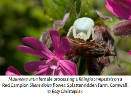 Rosy had an article published in the British Arachnological Society Newsletter about her crab spider research! This links to her outreach project and linked fieldwork exploring the mechanisms and outcomes underpinning crab spider-flower commensalisms. Read the full article in our recent blog post about it!