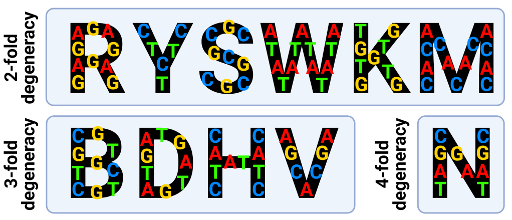 The sequence ‘HMK’ can represent any one of twelve different sequences (i.e., the degeneracy value is 12; we can reach this by multiplying up each individual degeneracy value – the number of bases each degenerate base can correspond to – which, in this case would be 2 * 2 * 3). Specifically, ‘H’ can be any base apart from ‘G’ (so, ‘A’, ‘C’ or ‘T’; all of the three-fold degeneracies are just the letter in the alphabet after the base that they exclude, bar ‘V’ since ‘U’ was already taken by uracil, which is present in RNA), ‘M’ can be ‘A’ or ‘C’, and ‘K’ can be ‘G’ or ‘T’. Of the possible combinations, cat, act and tag are all fairly standard English words (although some of the other combinations may have regional or archaic meanings too).