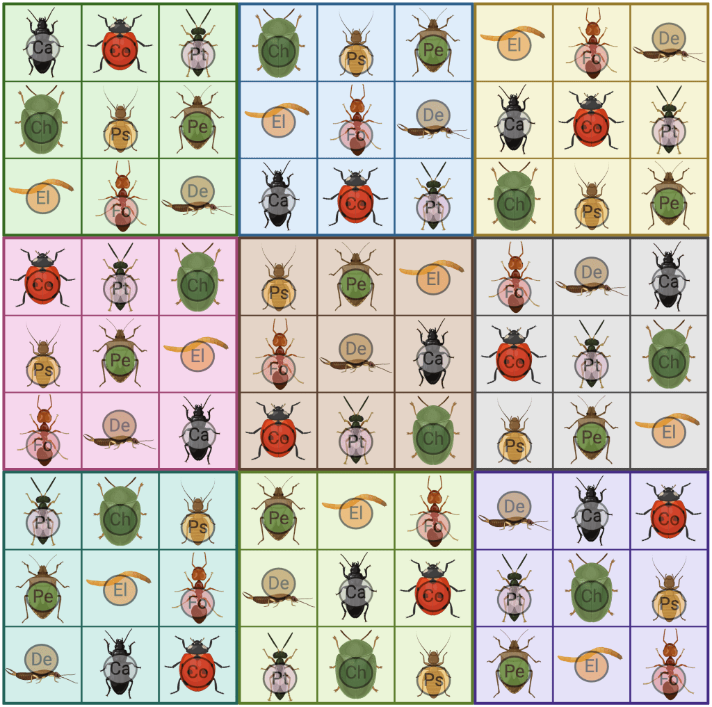 This month, we have a foraging sudoku for you! Nine species are busy searching for food, avoiding predators, or escaping parasitoids.