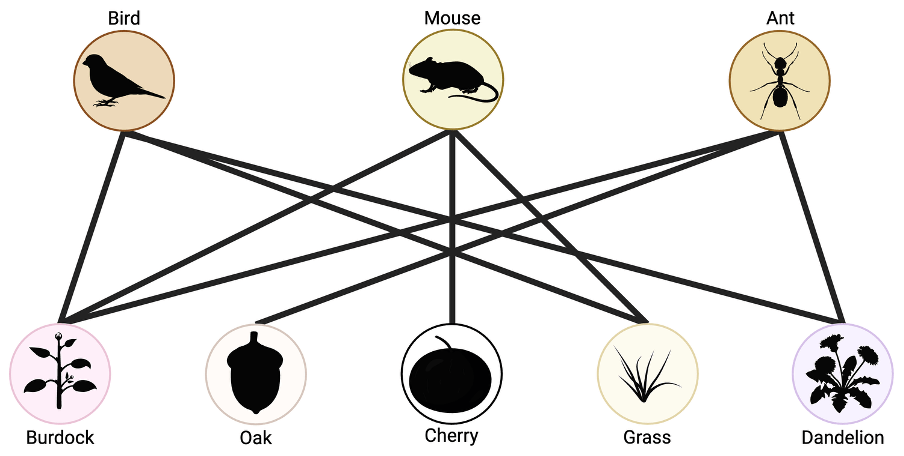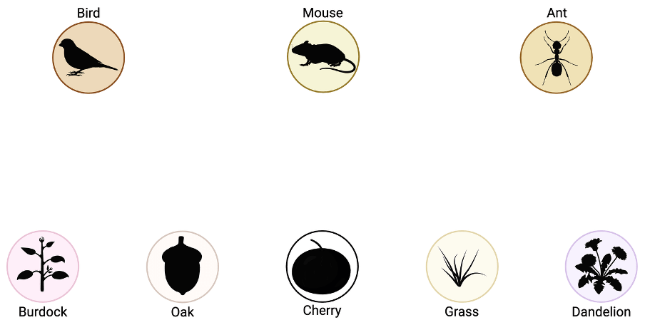 Three seed dispersers are foraging in close proximity to five plant species. The seed dispersers are a bird, a mouse and an ant. The plants are oak, cherry, grass, dandelion and burdock.
