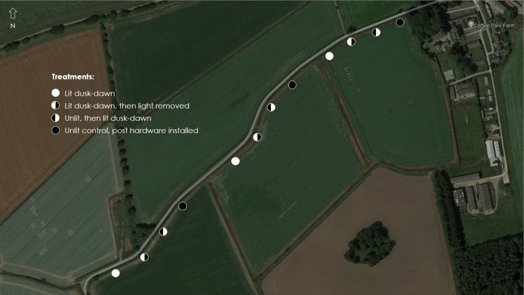 These different treatments can show us how ecological networks respond to a new light when it was previously dark, how they recover from a light being switched off, how they respond to light added in summer in the peak of insect activity season, and how the ecological networks are structured without any light added.