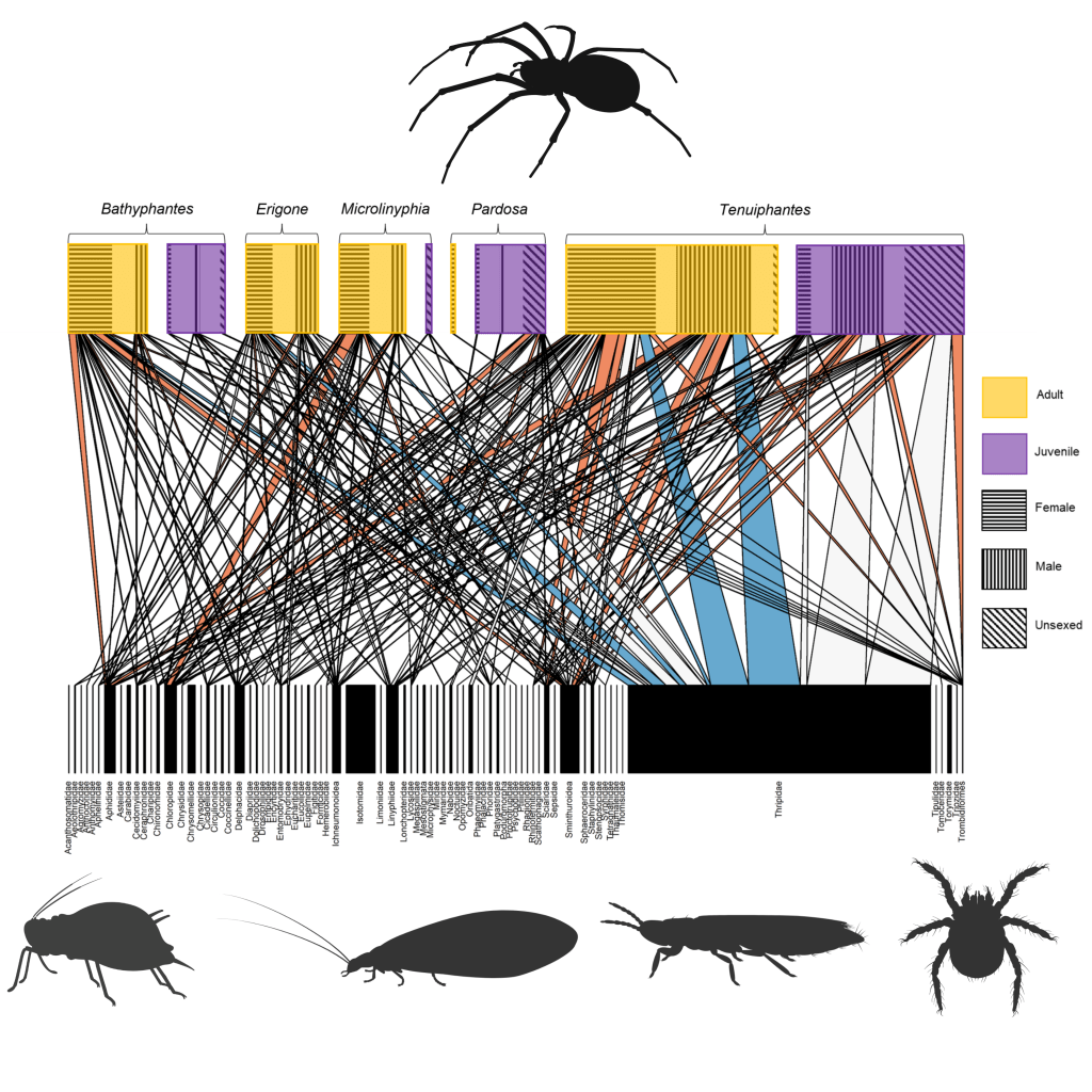 Cuff, Tercel, Vaughan, Drake, Wilder, Bell, Müller, Orozco-terWengel & Symondson (2025). Prey nutrient content is associated with the trophic interactions of spiders and their prey selection under field conditions. Oikos, 2025 (2): e10712.